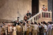 Ein Trio der absoluten Weltspitze für Amilcare Ponchiellis Operndrama über la Gioconda (Anna Netrebko, 3.v.r. auf der Treppe), Barnaba (Ludovic Tézier, 2.v.r. auf Treppe) und Enzo (Jonas Kaufmann, 5.v.r. auf der Treppe)Bild: © Luciano Romano/Teatro di San Carlo