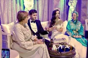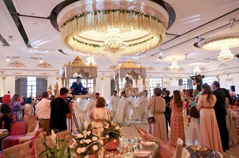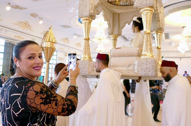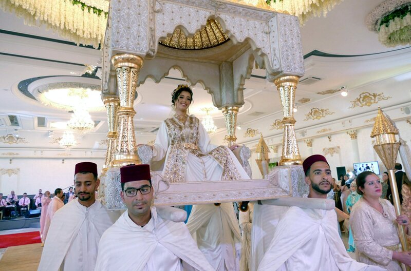 Alle Blicke ruhen auf der jungen Braut Yousra, wenn sie auf der Amaria-Sänfte durch den Saal getragen wird.Bild: © SWR/Mouchine El Ghomri