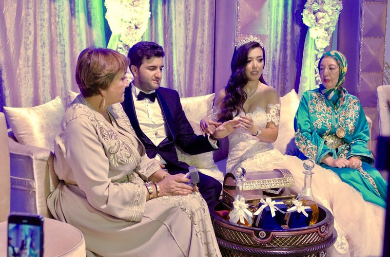 Schwiegermutter Samira, Bräutigam Othman aus Casablanca, Braut Yousra und ihre Mutter Rachida aus Fès beim Ringtausch (v.l.)Bild: © SWR/Mouchine El Ghomri