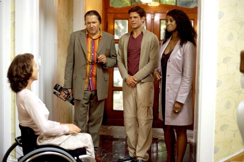 Linda (Gudrun Landgrebe, l.) hat eine achtwöchige Fitnesskur - persönlich betreut von dem erfolgreichen Trainer Vic (Steffen Groth, 2.v.r.) - gewonnen. Vics Manager Manni (Michael Brandner, 2.v.l.) und seine Assistentin Yvonne (Liz Baffoe, r.) sind dabei, als er die Nachricht überbringt.Bild: © DMB