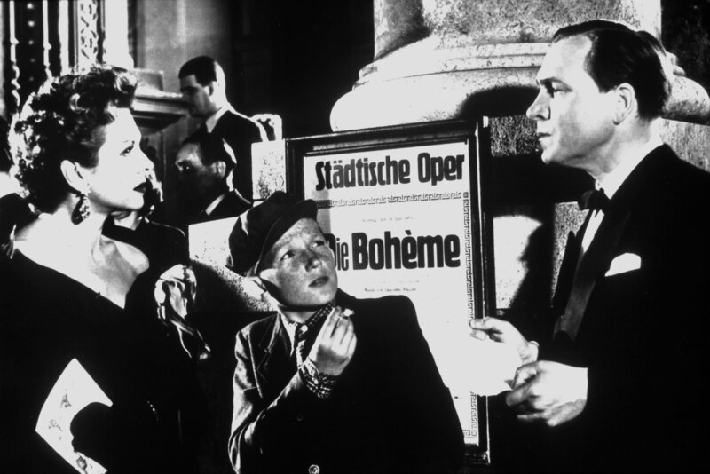 Der Lausebengel Klepperbein (Claus Kaap, Mitte) steckt den ahnungslosen Eheleuten Eva und Fritz Pogge (Hertha Feiler und Paul Klinger), dass ihre Tochter an einer Straßenecke Streichhölzer verkauft.