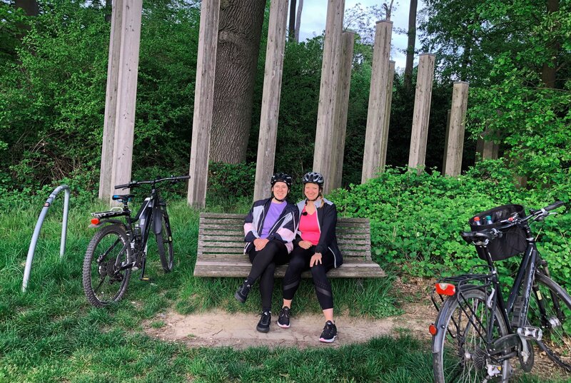 Corinna Breitling (li.) und Steffi Zellekens machen eine Pause auf ihrer Tour entlang der Regionalpark Rundroute.Bild: © HR/Monika Birk