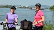 Start der Tour: Corinna Breitling (li.) und Steffi Zellekens an der Mainspitze.Bild: © HR/Monika Birk
