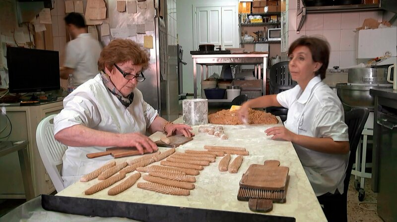 In der Backstube von Maria Grammatico (am Tisch links) in Erice auf Sizilien. Die alte Sizilianerin backt nach alten Klosterrezepten und legt immer noch selbst mit Hand an.Bild: © HR