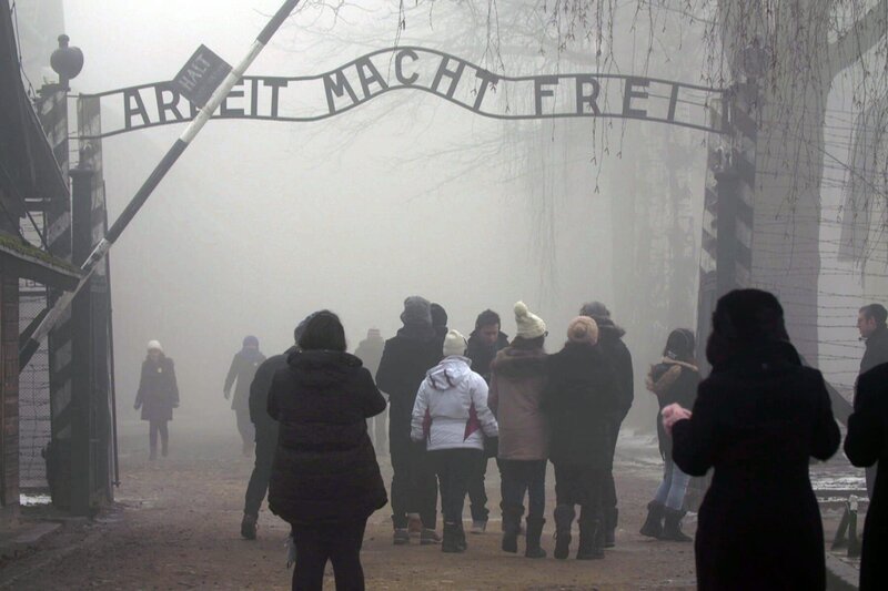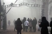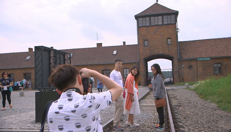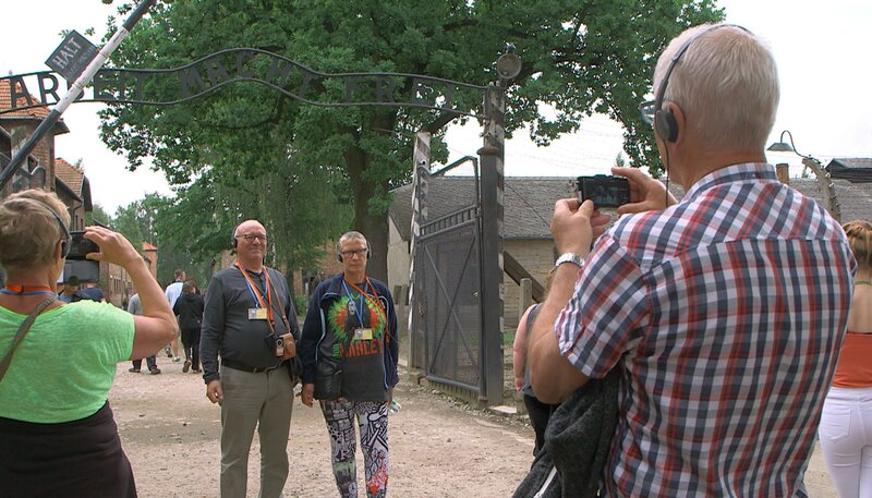 Touristen vor dem Tor des Todes in Auschwitz.Bild: © MDR/Jonathan Hayoun/Terranoa