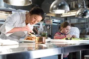 Sie schaut ihm genau über die Schulter: Kate (Catherine Zeta-Jones, r.) ist anfangs über den neuen Koch Nick (Aaron Eckhart, l.) alles andere als begeistert. Dennoch kann sie ihre Faszination für seine Kreationen nicht verbergen ...Bild: © 3+