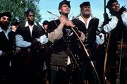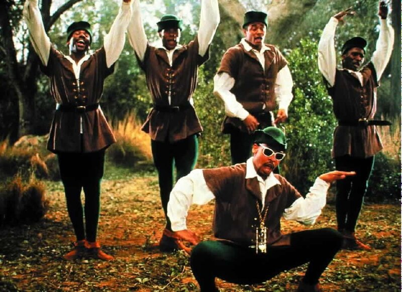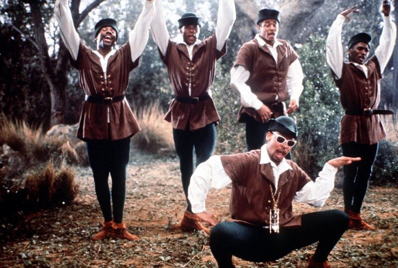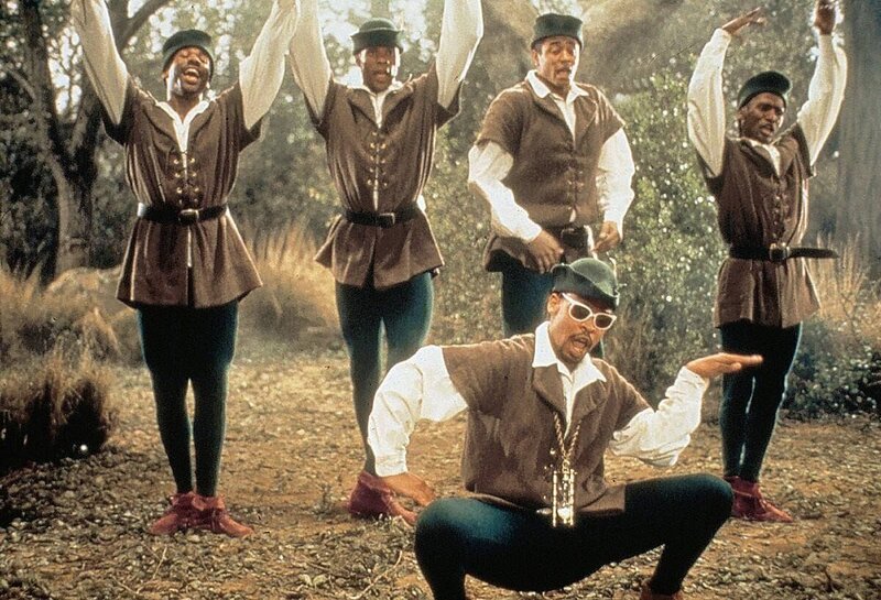 Robin (Cary Elwes, M.) kämpft zusammen mit seinem treuen Diener Blinzler (Mark Blankfield, l.), seinem arabischen Freund Ahchoo (David Chappelle, 2.v.l.), dem Hünen Little John (Eric Allan Kramer, 2.v.r.) und Will Scarlet O'Hara (Matthew Porretta, r.) aus Georgia gegen den tyrannischen und vertrottelten Prinz John ...Bild: © Twentieth Century Fox Film Corporation