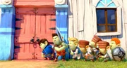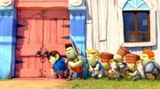 Die sieben Zwerge finden verdächtige Spuren, die auf eine Hexe hinweisen. Dann hören sie plötzlich Geräusche aus dem Haus. Ob sich hinter der Tür wohl eine Hexe verbirgt...?Bild: © LOCUS Corporation
