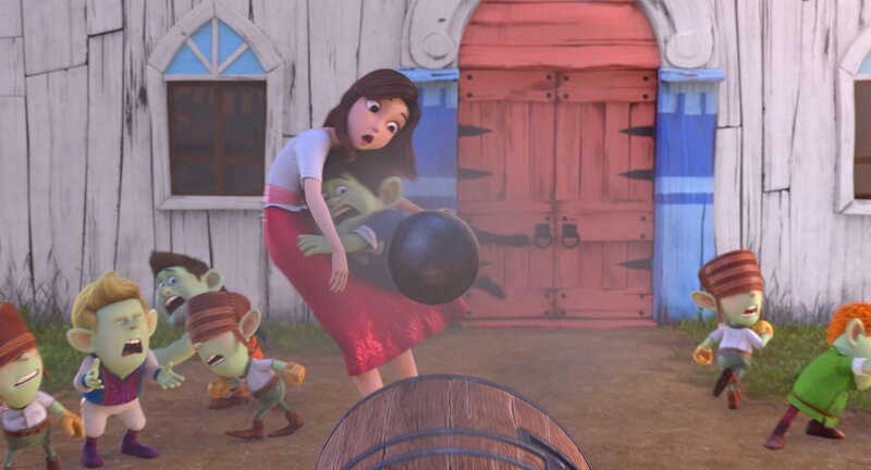 Die sieben Zwerge werden von einem Prinzen und seiner Garde angegriffen, da er die kleinen grünen Kreaturen für Monster hält, die Schneewittchen (mi.li.) festhalten und bedrohen. Merlin rettet Schneewittchen vor einer Kanonenkugel.Bild: © LOCUS Corporation