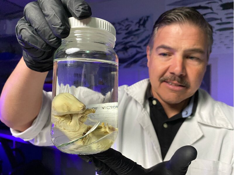 Aus diesem konservierten Embryo gewinnt Prof. Andrew Pask von der Universität Melbourne wichtige Genbausteine für den Beutelwolf.Bild: © Herbert Ostwald/autentic / ZDF