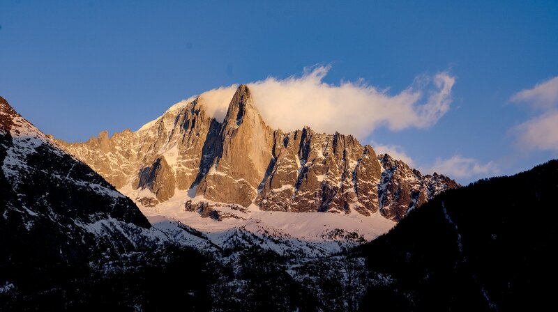 Die letzten Sonnenstrahlen bringen das Mont Blanc Massiv zum Glühen.Bild: © NDR/elb motion pictures GmbH/Florian Lengert