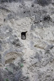 Der junge Steinkauz wartet vor der Höhle ungeduldig auf das Futter.