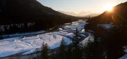 Die Isar im winterlichen Sonnenuntergang. Dahinter zu sehen ist die Zugspitze, Deutschlands höchster Berg.