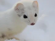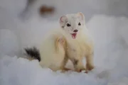 Das Hermelin erfreut sich mittels Freudensprünge am frisch gefallenem Schnee.