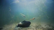 Bitterlinge balzen vor einer Teichmuschel.