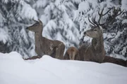 Ein Rudel Rotwild steht gefangen im frisch gefallenem Tiefschnee.
