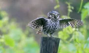 Der Steinkauz überrascht mit der Liebe zur Regendusche. Seine Performance gleicht einem eigens dafür kreierten Regentanz.