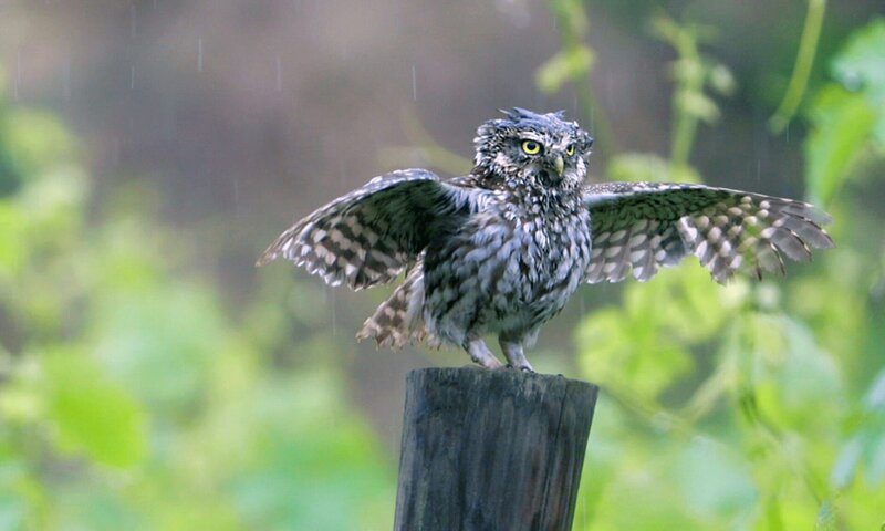 Der Steinkauz duscht sich minutenlang im Sommergewitter. Er vollzieht dabei einen streng choreographierten Regentanz.