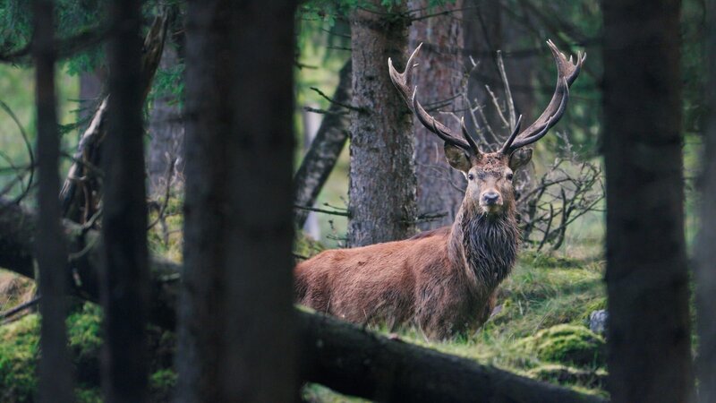 Ein Rothirsch wandert vom Hochgebirge hinab bis in die Moore der Ebene.