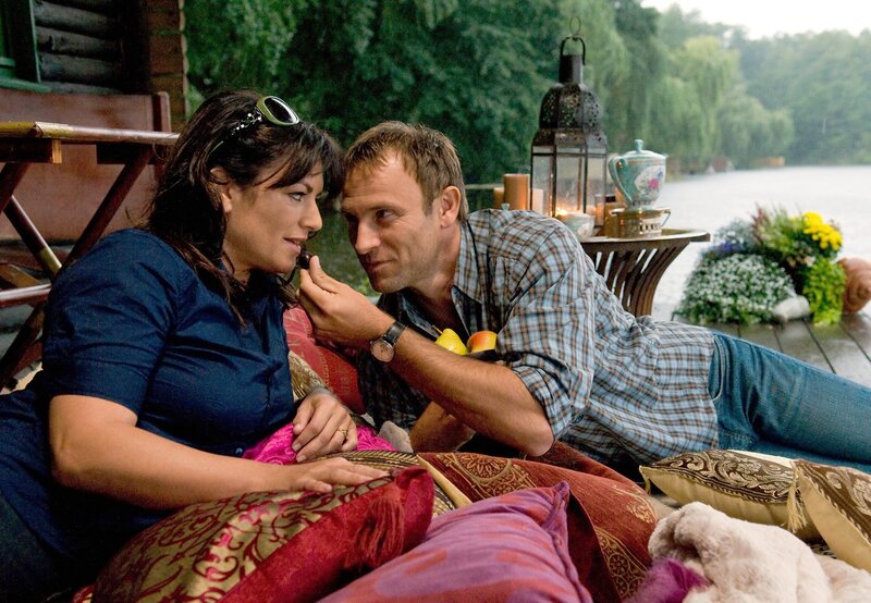 Während Lilly (Christine Neubauer) und Ulli (Bernhard Bettermann, links) sich zaghaft näherkommen, paddelt Christian (Oliver Bootz) heran und versucht, seine Ex-Freundin zurückzugewinnen.