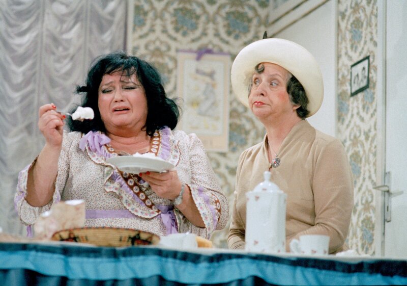 SCHEIDUNG AUF KÖLSCH 11.10.1981 Schwank in drei Akten von Trude Herr Aufzeichnung aus dem Kölner Theater im Vringsveedel Katharina Engel, Besitzerin eines Miederwarengeschäfts muss erfahren, dass ihr Ehemann, ein biederer Beamter, offenbar femdgeht. Katharina Engel (Trude Herr) und Adele Koehler (Anita Riotte) ©WDR/KratzerBild: © WDR/Kratzer