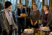 Stolz präsentiert der Hobbykoch Christian (Jan-Gregor Kremp) seiner Tochter Marie (Anna Hausburg, re.) und seinen Gästen Florian (François Goeske) und Fanny (Mariele Millowitsch) seine Spezialität: Kürbissuppe, serviert im Kürbis.Bild: © ARD Degeto/Jan Betke