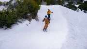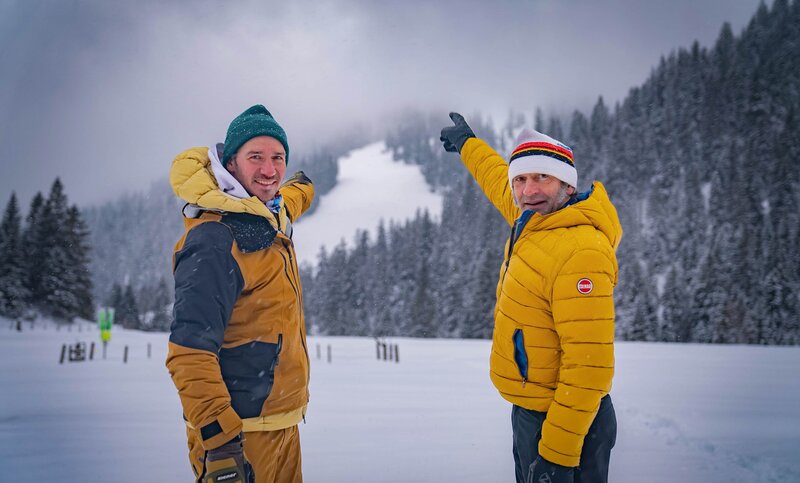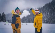 Felix Neureuther (vorne) und der Schmidt Max erkunden Wintersportgebiete im Wandel.Bild: © BR/André Goerschel