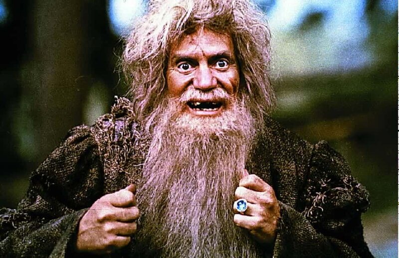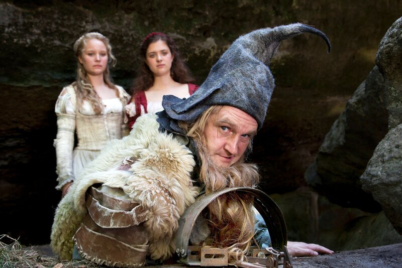 Der Zwerg (Detlev Buck, rechts) hat sich mit seinem stolzen Bart in einer Bärenfalle verfangen. Er bittet Schneeweißchen (Sonja Gerhardt, links) und Rosenrot (Liv Lisa Fries, mitte) um Hilfe.