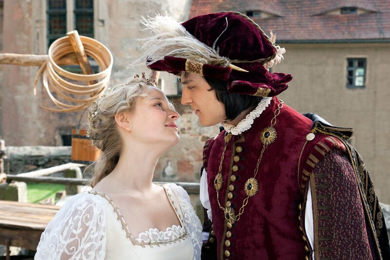 Prinz Jakob (Daniel Axt, rechts) ist von seinem bösen Fluch befreit und kann jetzt Schneeweißchen (Sonja Gerhardt, links) auf dem königlichen Schloss zur Frau nehmen. Ihre Liebe besiegeln sie mit einem Kuss.