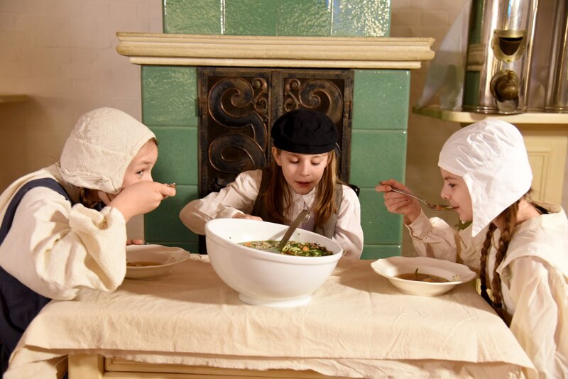 Die junge Dienerschaft stärkt sich mit der reichhaltigen Würstelsuppe.Bild: © ORF/Produktion West/Gerhard Mader