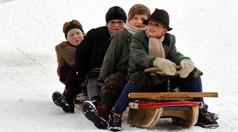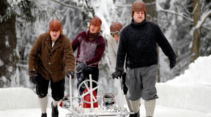 Schon damals zusammen auf dem Bob (v. li. n. re.): Leusl Peter (Florian Thompson), Franzl (Phillip Epping), Gustl (Josef Friedl) und Gamser (Lucas Bauer).Bild: © Constantin Television GmbH