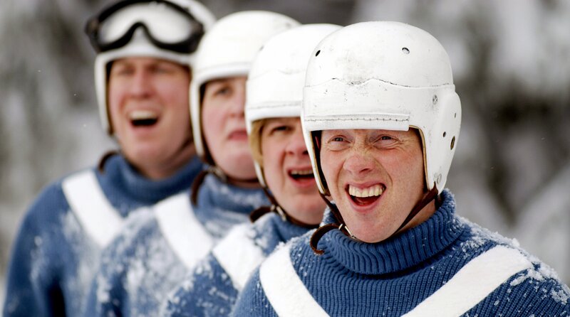 Bobfahrer Gamser (Sebastian Bezzel, Mitte unten) will mit seinen Spezis (Simon Schwarz, Mitte hinten), Franzl (Michael A. Grimm, r.) und Gustl (Antoine Monot Jr., li.) Olympia gewinnen.Bild: © Constantin Television GmbH