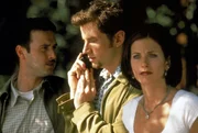 Zum zweiten Mal am Ort des Geschehens: Filmfreak Randy Meeks (Jamie Kennedy, M.), Deputy Dewey Riley (David Arquette, l.) und Journalistin Gale Weathers (Courteney Cox, r.) ...