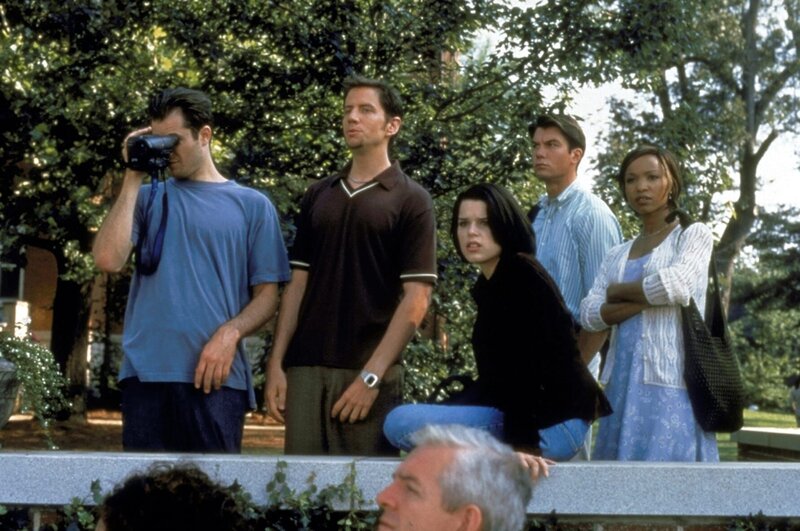 Alles würde seinen normalen Gang am Windsor College gehen, wäre nicht der neueste Hit "Stab" ins Kino gekommen. Denn für Mickey (Timothy Olyphant, l.), Randy (Jamie Kennedy, 2.v.l.), Sidney (Neve Campbell, M.), Derek (Jerry O'Connell, 2.v.r.) und Hallie (Elise Neal, r.) endet das Drama ihres Lebens nicht auf der Leinwand ...