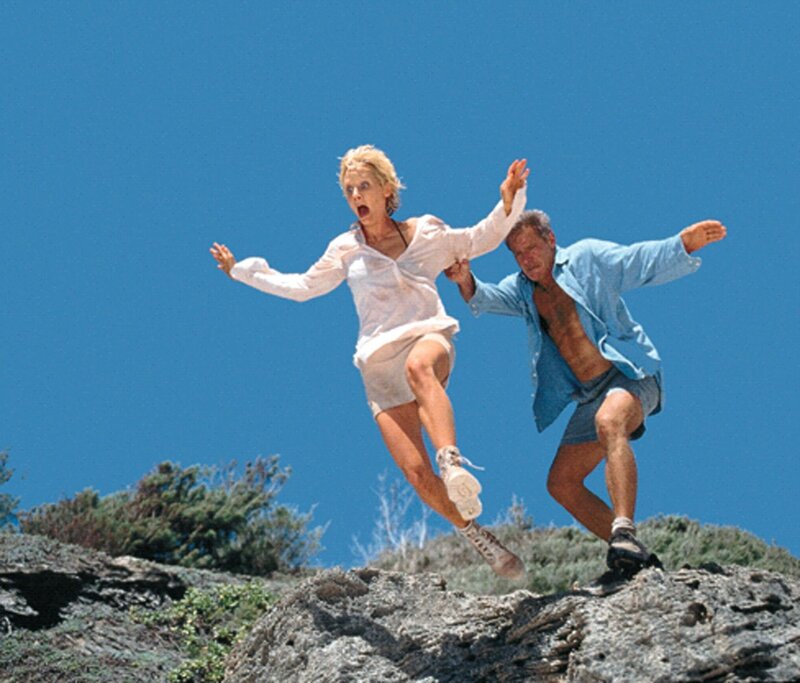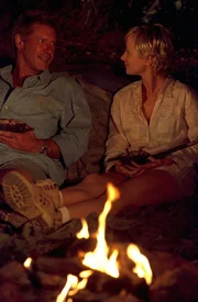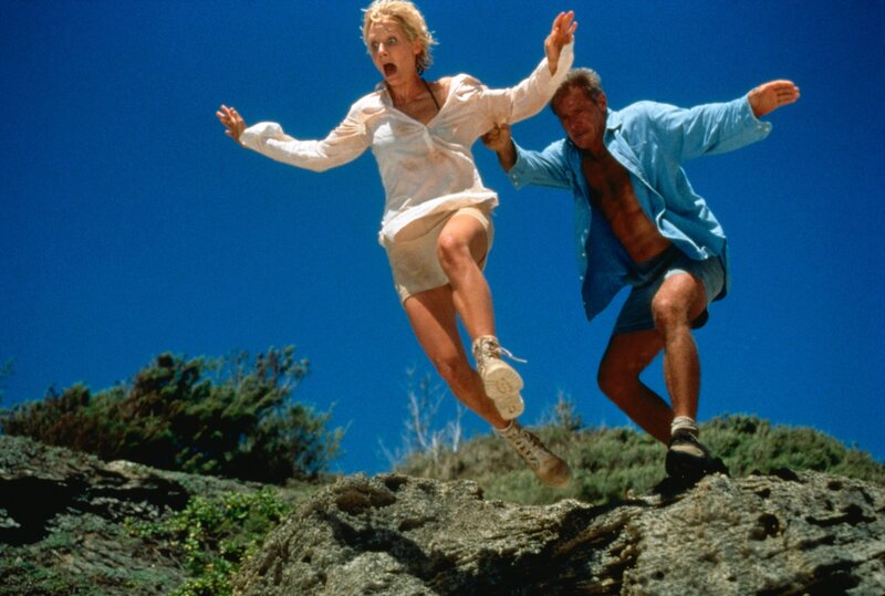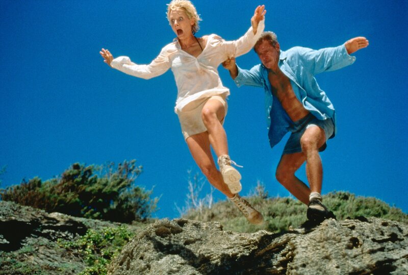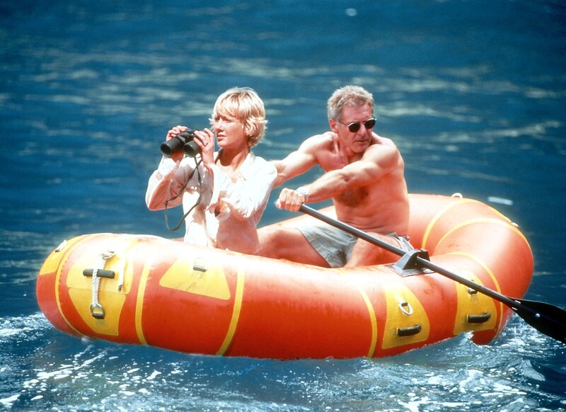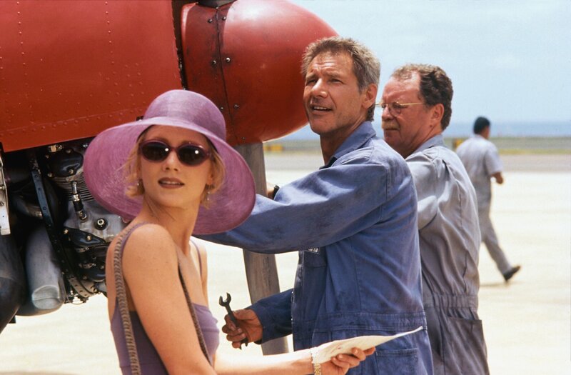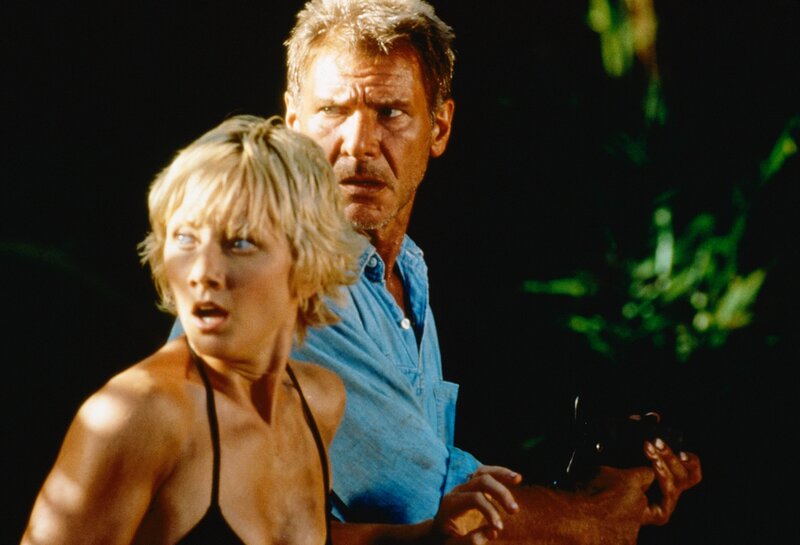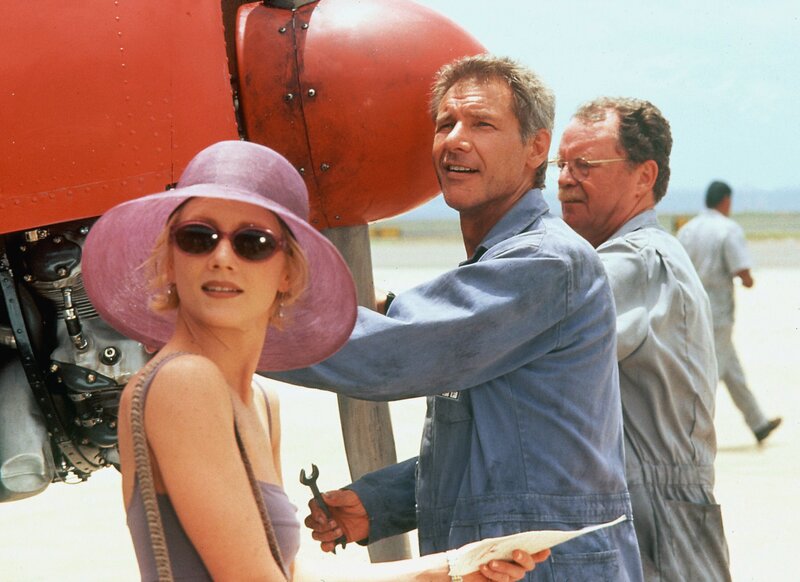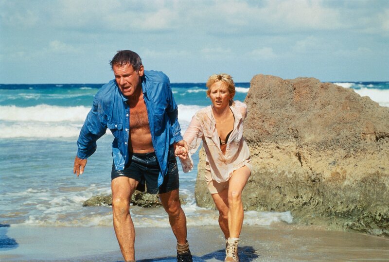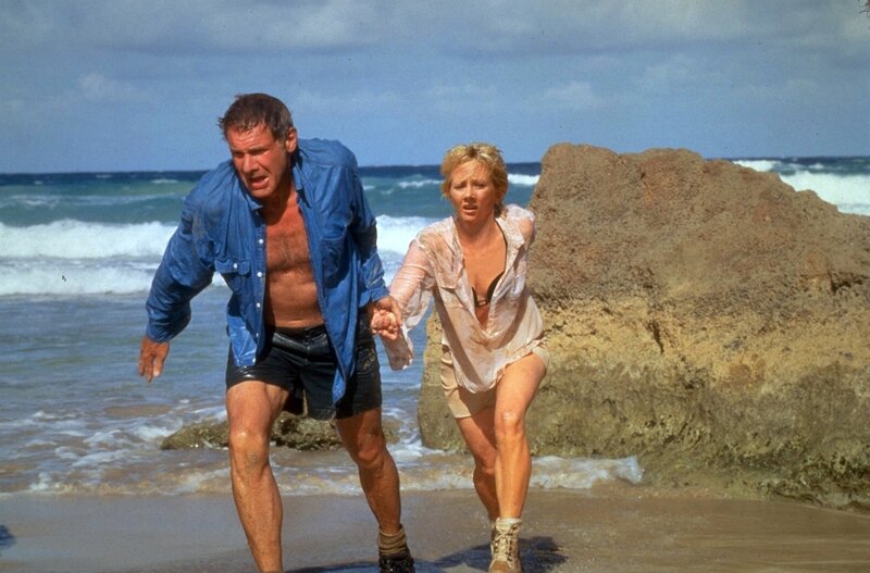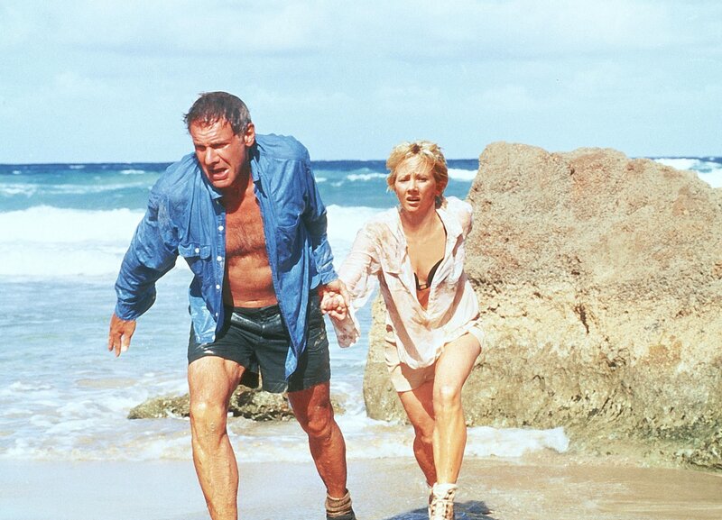 Die Journalistin Robin Monroe (Anne Heche, l.) und der Frachtpilot Quinn Harris (Harrison Ford, re.) sind ausgerechnet auf einer Insel notgelandet, die Piraten als Unterschlupf dient und befinden sich von diesem Moment an auf der Flucht.