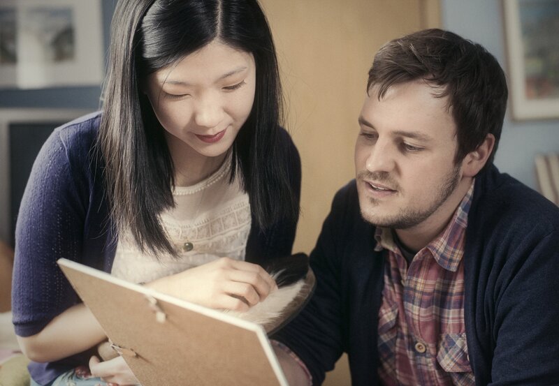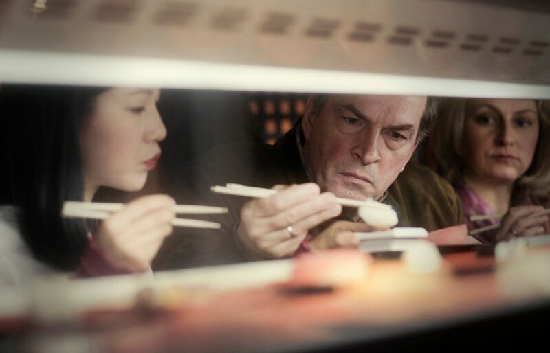 Kluftinger (Herbert Knaup) und seine Frau Erika (Margret Gilgenreiner, rechts) wollen Yumiko (Joy Maria Bai, links) beeindrucken, die japanische Freundin ihres Sohnes Markus. Der Kommissar ahnt noch nicht, dass Sushi kalter Fisch ist.