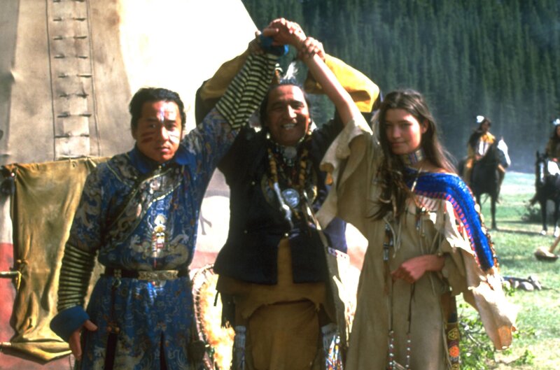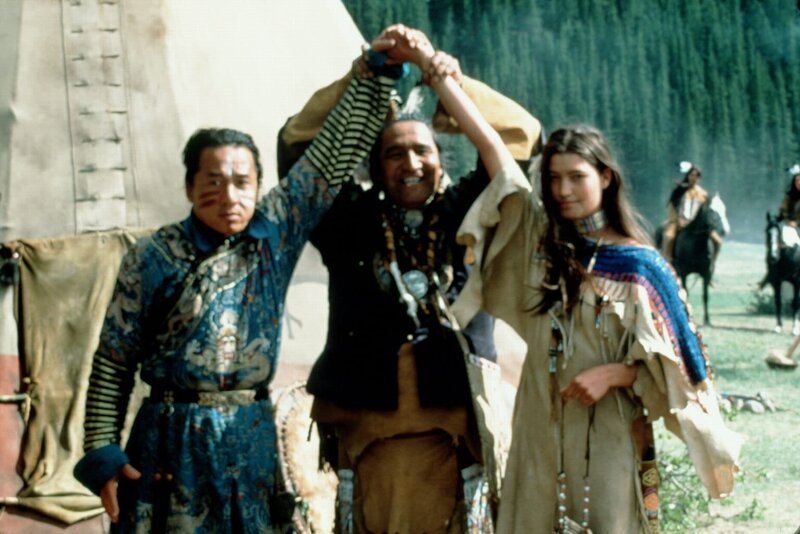 Nach einer durchzechten Nacht unter Rothäuten findet sich Chon (Jackie Chan, l.) am nächsten Morgen als Verheirateter wieder. Der Sioux-Häuptling (Russell Badger, M.) übergibt ihm das Indianermädchen Falling Leaves (Brandon Merrill, r.) ...