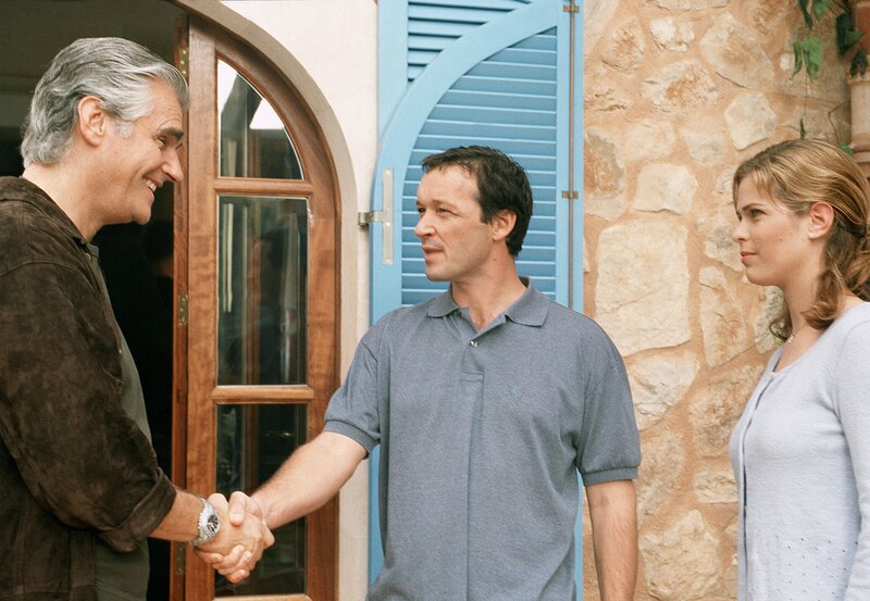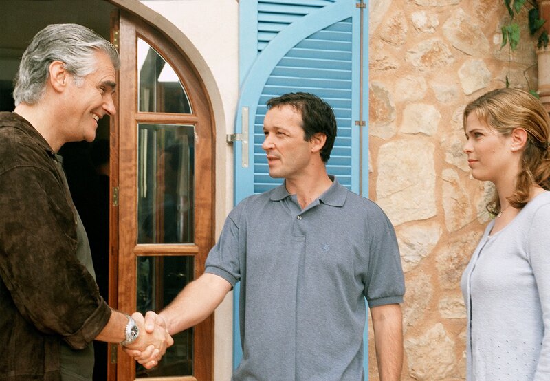 Der Bauunternehmer Uli Fischer (Michael Roll, Mitte) will zusammen mit seiner Assistentin und Freundin Jana (Ursula Buschhorn) den Grundstücksbesitzer Alejandro Perez (Sky Du Mont) dazu bringen, einen herrlichen Landstrich auf Mallorca zu verkaufen.