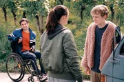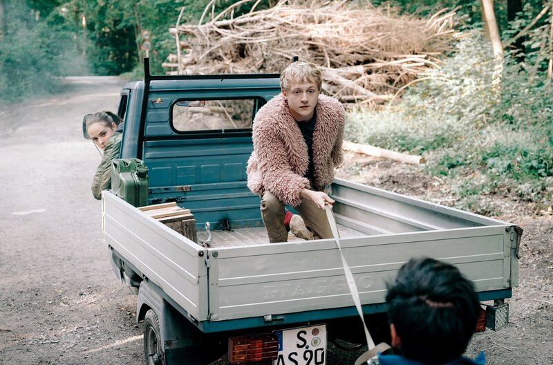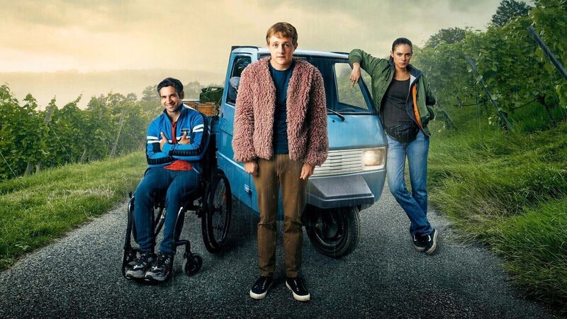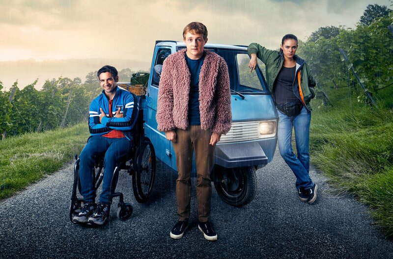 Nach einer folgenschweren Entscheidung begibt sich Außenseiter Flake (Jakob Schmidt, Mitte) mit Drogendealerin Kim (Emma Floßmann) und Rollstuhlfahrer Philipp (Daniel Rodic) auf einen turbulenten Roadtrip – mit einer 11 PS starken Ape Piaggio.Bild: © Arte