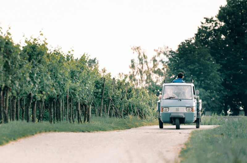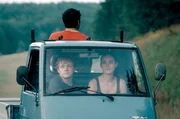 Ein Roadmovie, in dem Flake (Jakob Schmidt, Mi.), Kim (Emma Floßmann, re.) und Philipp (Daniel Rodic, li.) in einem Piaggio-Mopedauto mit maximal 45 Stundenkilometern von Stuttgart an den Bodensee fahrenBild: © SWR/Hugo Lenhardt/Giganten Film
