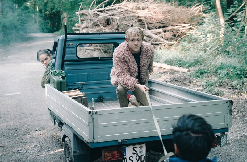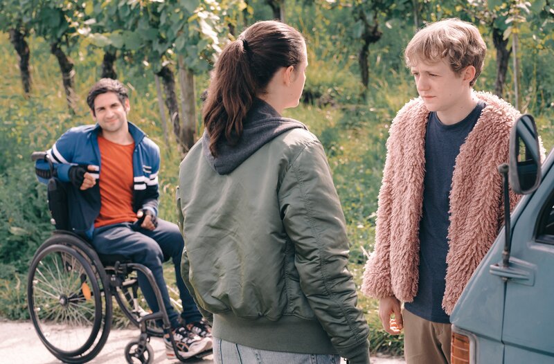 Während sie von einem Neonazi verfolgt werden, bleiben Kim (Emma Floßmann) und Flake (Jakob Schmidt, Mi.) keine Zeit um Philipps (Daniel Rodic, re.) Rollstuhl auf das italienische Mopedauto zu laden.