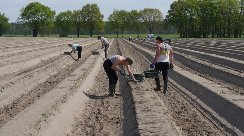 Wer im Frühjahr durch Brandenburg fährt, sieht Landschaften unter Folie: Spargelfelder, so scheint es, sind nur im Anbau unter kilometerlangen Plastiktunneln wirtschaftlich. Der Film begleitet die Familie Scharkowski durch die Spargelsaison. Er will herausfinden, was hier anders läuft. - Erntehelfer bei der Arbeit.