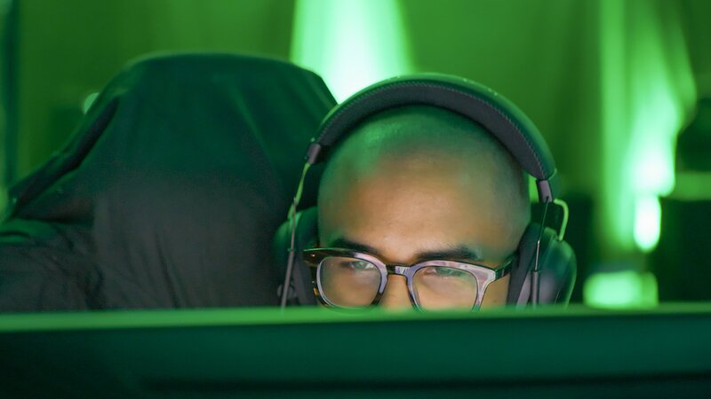 Game-Trainer Ron Manjang schaut auf seinem Bildschirm seinen Schützlingen beim Training in einem Videospiel zu und gibt ihnen über das Headset Anweisungen für eine taktischere Spielweise.Bild: © ZDF / Andrzey Król
