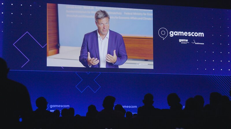 Robert Habeck präsentiert sich in einer digitalen Videobotschaft zur feierlichen Eröffnung der Gamescom als Games-Minister und verspricht der Videospielbranche politische Unterstützung.Bild: © Patrick Maazouz / ZDF