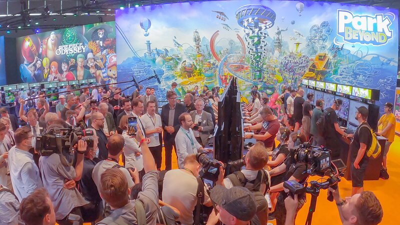 Politiker:innen probieren während des politischen Rundgangs auf der Gamescom, das Videospiel "Park Beyond“, an einem Stand der Videospielmesse aus.Bild: © Patrick Maazouz / ZDF