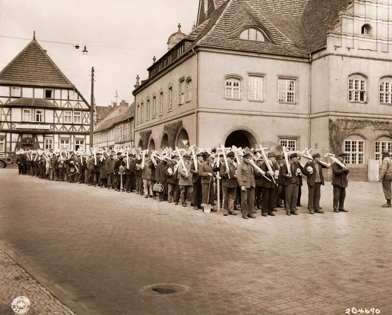 Die Einwohner Gardelegens ziehen mit Kreuzen aus der Stadt, um im April 1945 Gräber für die Opfer des Massakers anzulegen.Bild: © MDR/United States Holocaust Memorial Museum