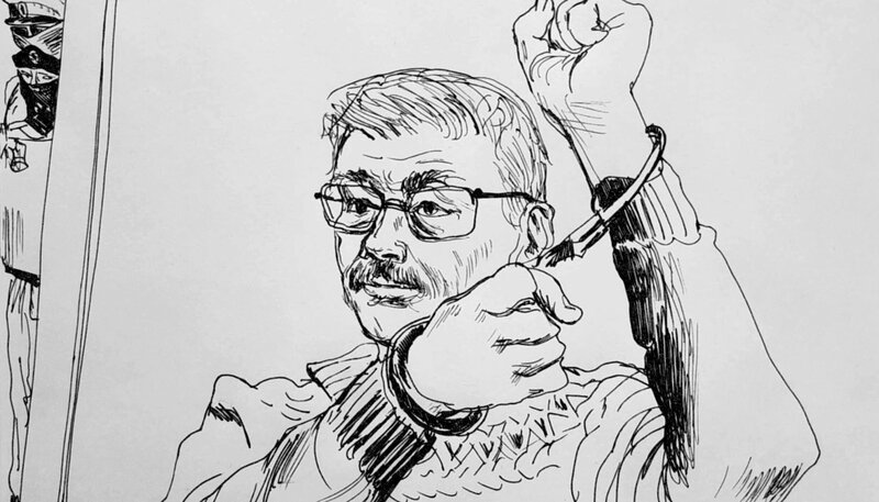 Eine Gerichtszeichnung von Oleg Orlov, Friedensnobelpreisträger und Leiter der Nichtregierungsorganisation Memorial, die sich für das Erinnern an die Verbrechen des Regimes einsetzt. Trotz Drohungen blieb er in Russland und wurde wegen seiner Antikriegshaltung zu zweieinhalb Jahren Haft im Straflager verurteilt.