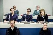(v.l.n.r.) Jan-Carl Raspe (Rafael Stachowiak), Andreas Baader (Henning Flüsloh) und Gudrun Ensslin (Lilith Stangenberg) beim Stammheim-Prozess.Bild: © SWR/Hendrik Heiden
