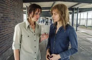Ulrike Meinhof (Tatiana Nekrasov) im Gespräch mit Gudrun Ensslin (Lilith Stangenberg) beim Hofgang in der JVA StammheimBild: © SWR/Hendrik Heiden