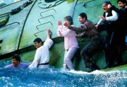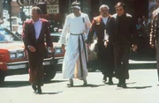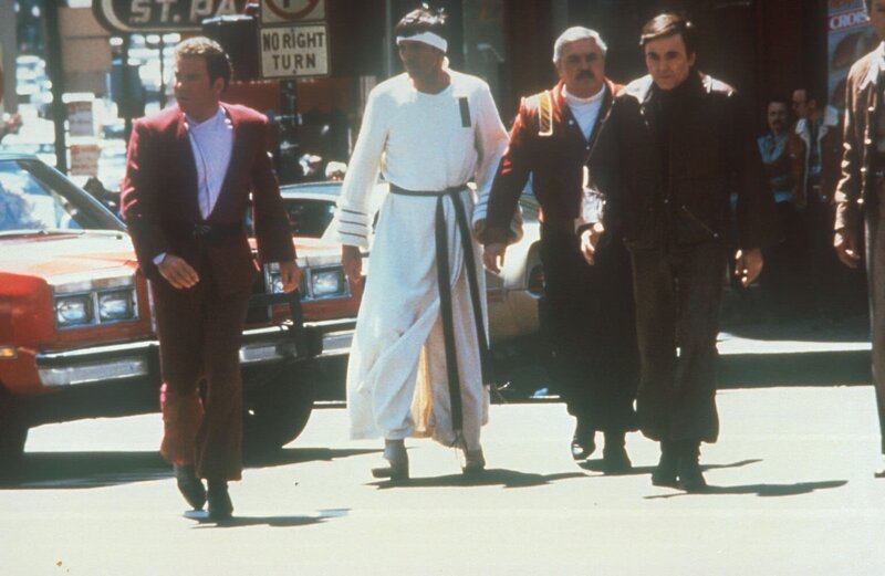 Kirk (William Shatner, l.), Spock (Leonard Nimoy, 2.v.l.), Scotty (James Doohan, 2.v.r.) und Chekov (Walter Koenig, r.) im San Francisco der Gegenwart, wo man sich auch als Zeitreisender mit futuristischem Outfit unauffällig bewegen kann - nur mit den Verkehrsregeln hapert's noch etwas ...Bild: © ATV II